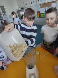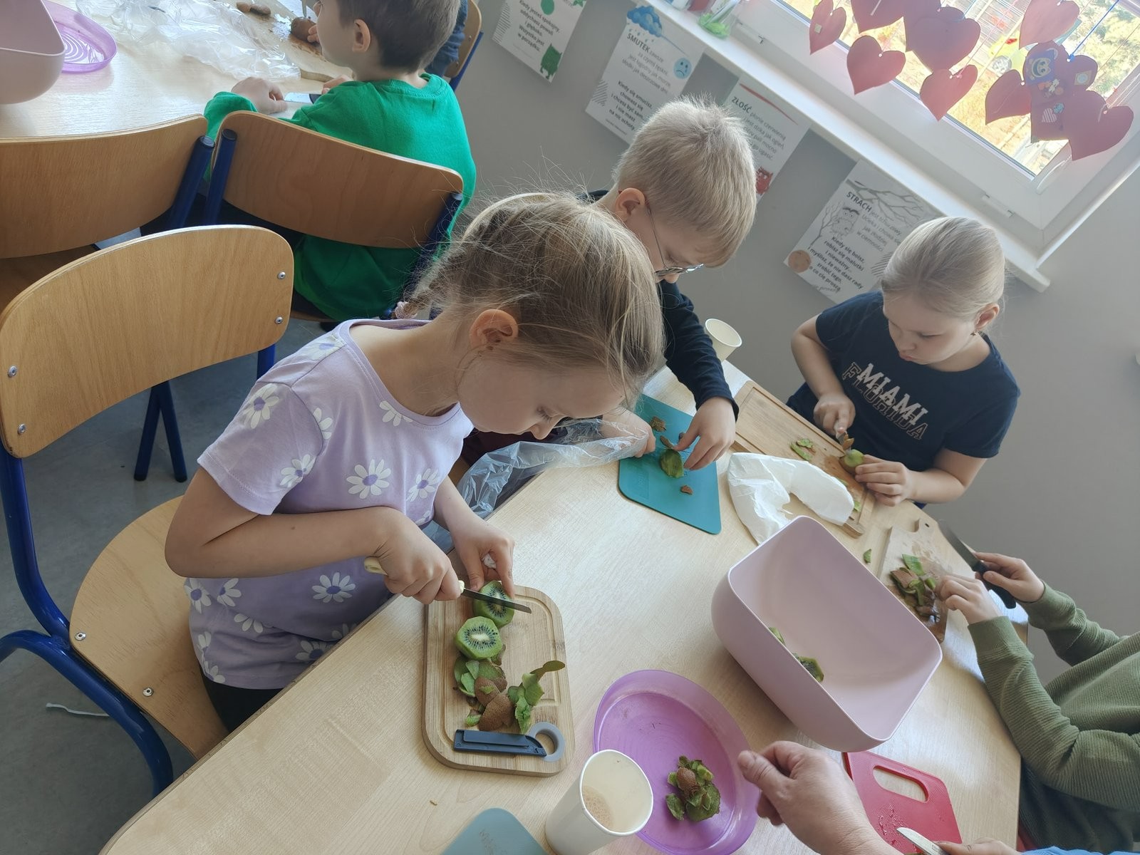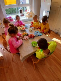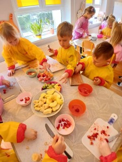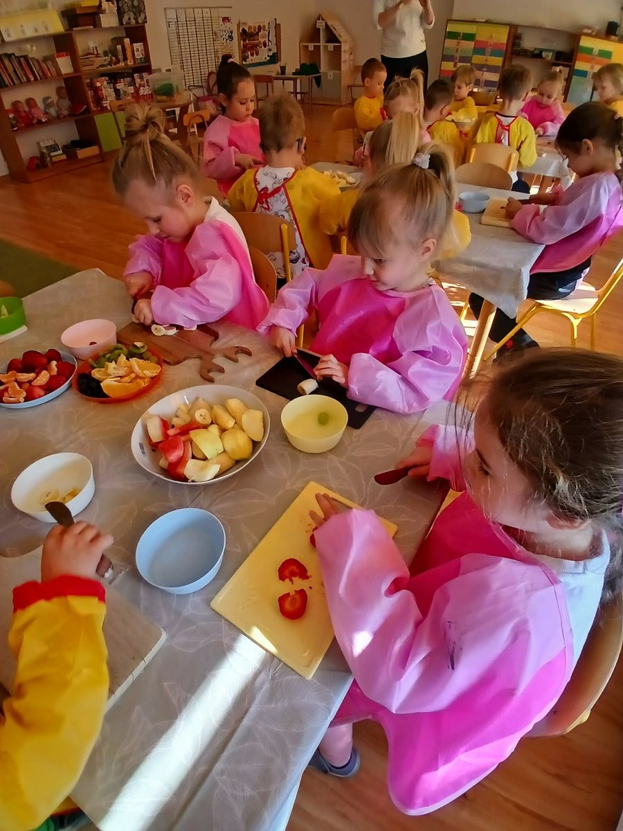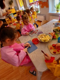 1. wykonanie sałatki owocowej przez grupę Biedronek, która nauczyła się, jak dobierać świeże owoce i ich wartości odżywcze;
