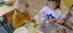 2. tworzenie kolorowych szaszłyków przez grupę Motylków i Kotków co pozwoliło dzieciom na twórczą zabawę oraz poznanie różnych smaków i tekstur;