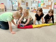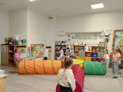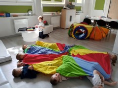 Kolejny blok tematyczny w naszej pracowni to "Podróże przez tunele" przedszkolaki chętnie współpracują w parach i zespole, rozwijają umiejętności czworakowania, usprawniają motorykę dużą a na zakończenie podróży wyciszają się.