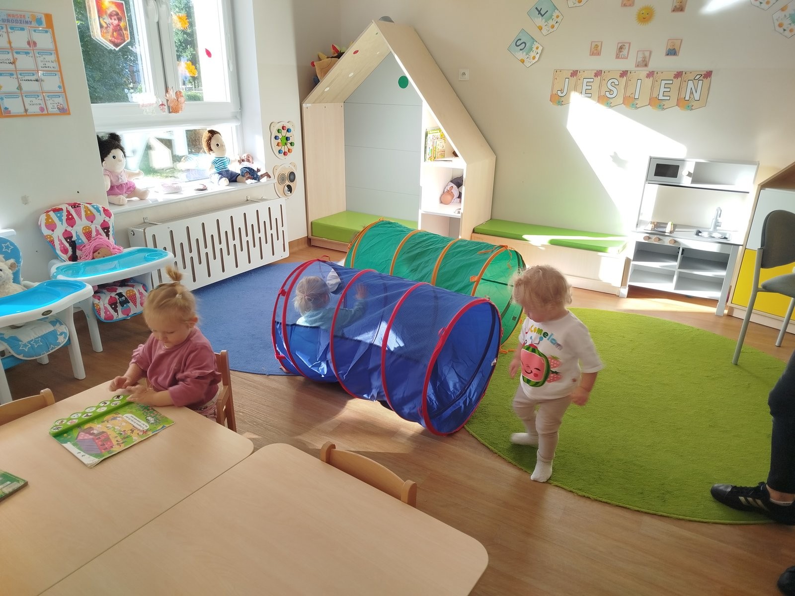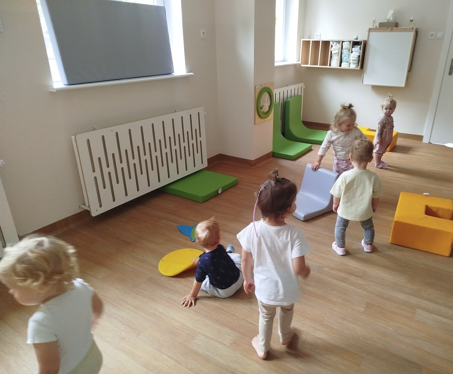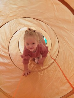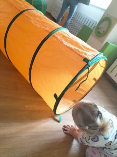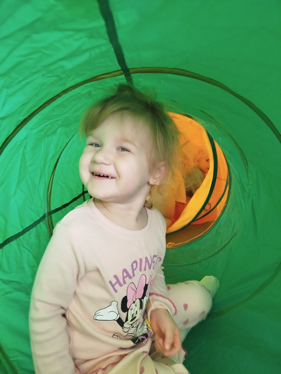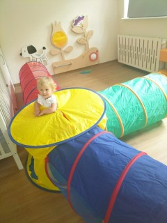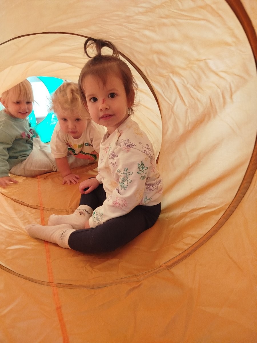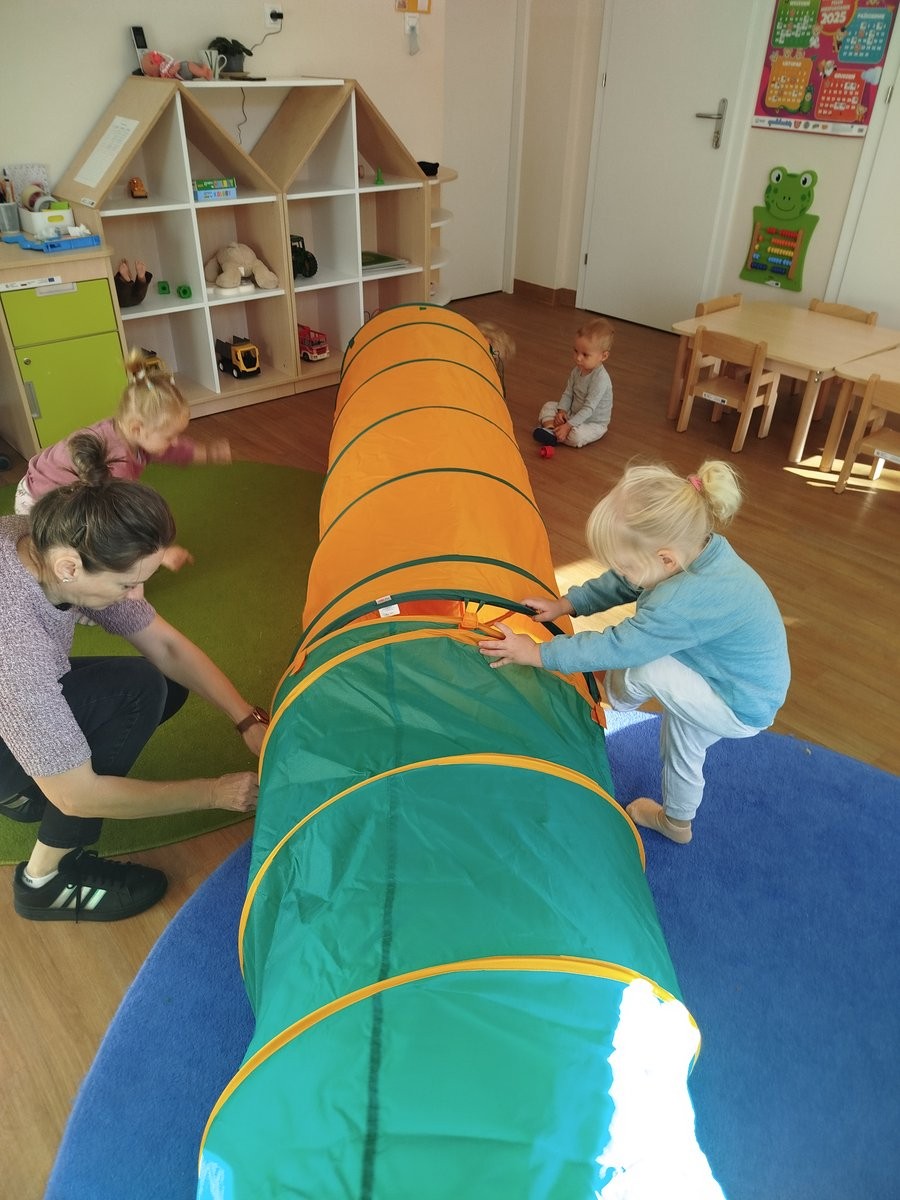 W dniu 12 listopada 2025 nasze Słoneczka brały udział w zabawach ruchowych, w trakcie których pokonywały przeszkody, takie jak przejście przez tunel gimnastyczny oraz pokonywanie klocków piankowych.