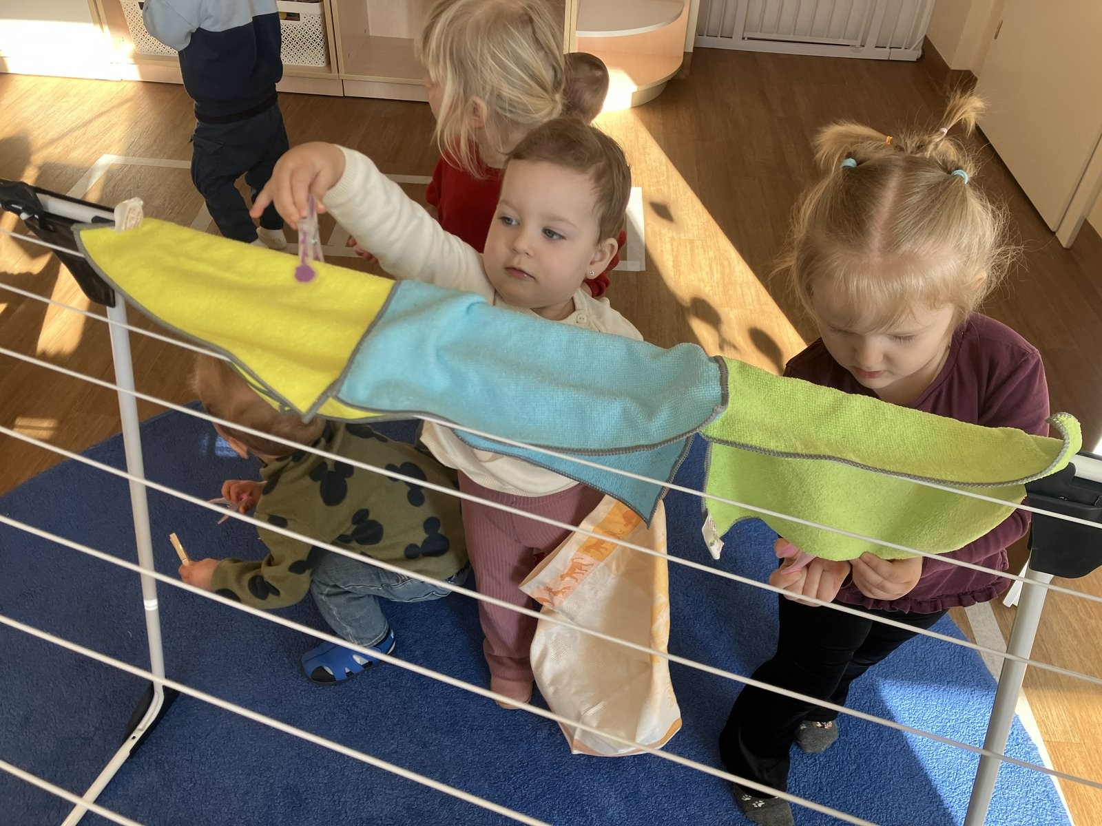 - Rozwieszaniu prania: Po zakończonym praniu, nasze "Słoneczka" miały okazję rozwiesić świeżo wyprane ubrania na suszarce.
