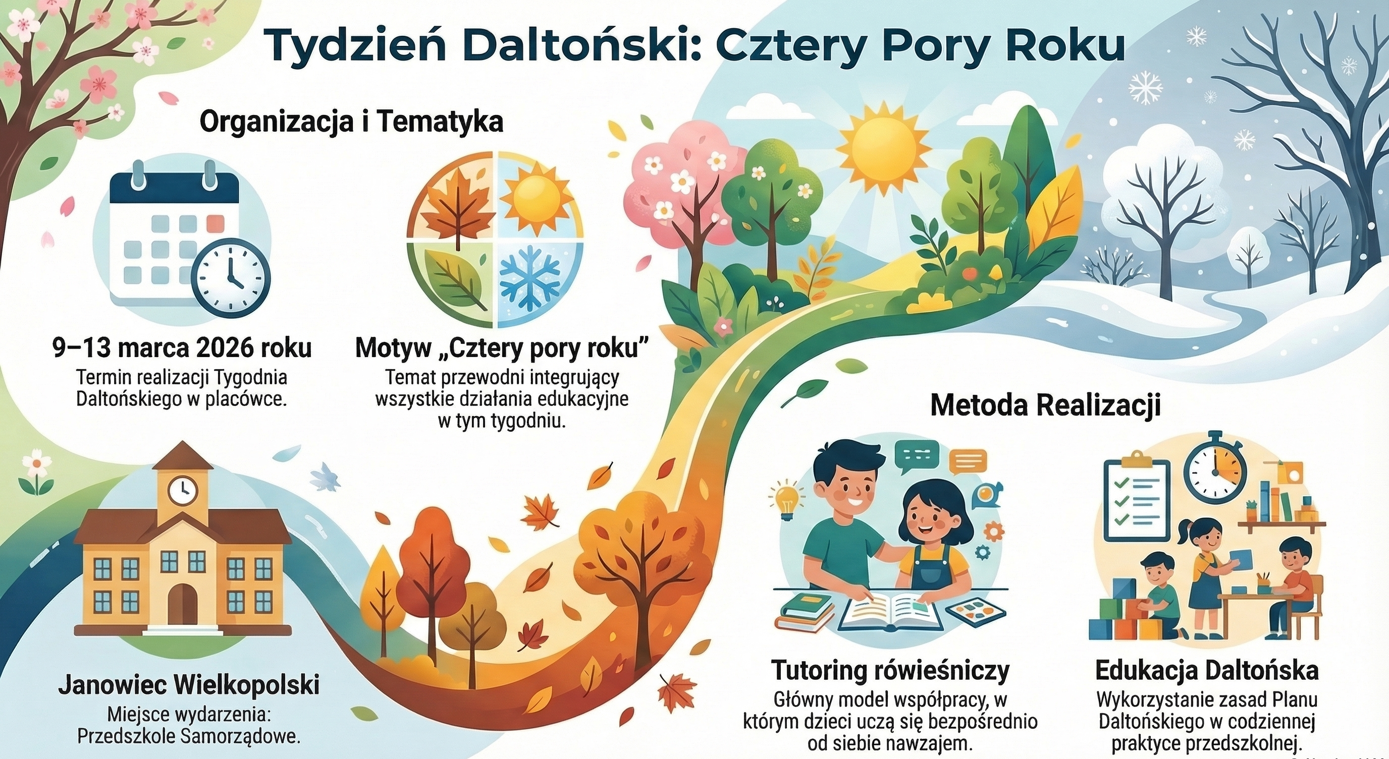 Od 9 marca do 13 marca 2026 roku realizujemy w Przedszkolu Samorządowym w Janowcu Wielkopolskim „Tydzień Daltoński” na zasadzie tutoringu rówieśniczego pt. „Cztery pory roku”.