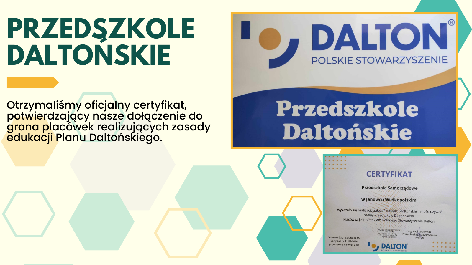 Kuratorium Oświaty w Bydgoszczy umieściło informację o uzyskaniu certyfikacji od Polskiego Stowarzyszenia Dalton dwóch placówek w powiecie żnińskim. Do tego grona włącza się oczywiście nasze przedszkole.