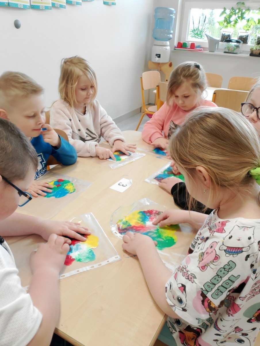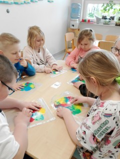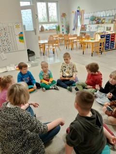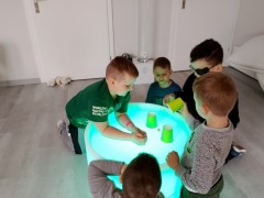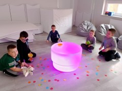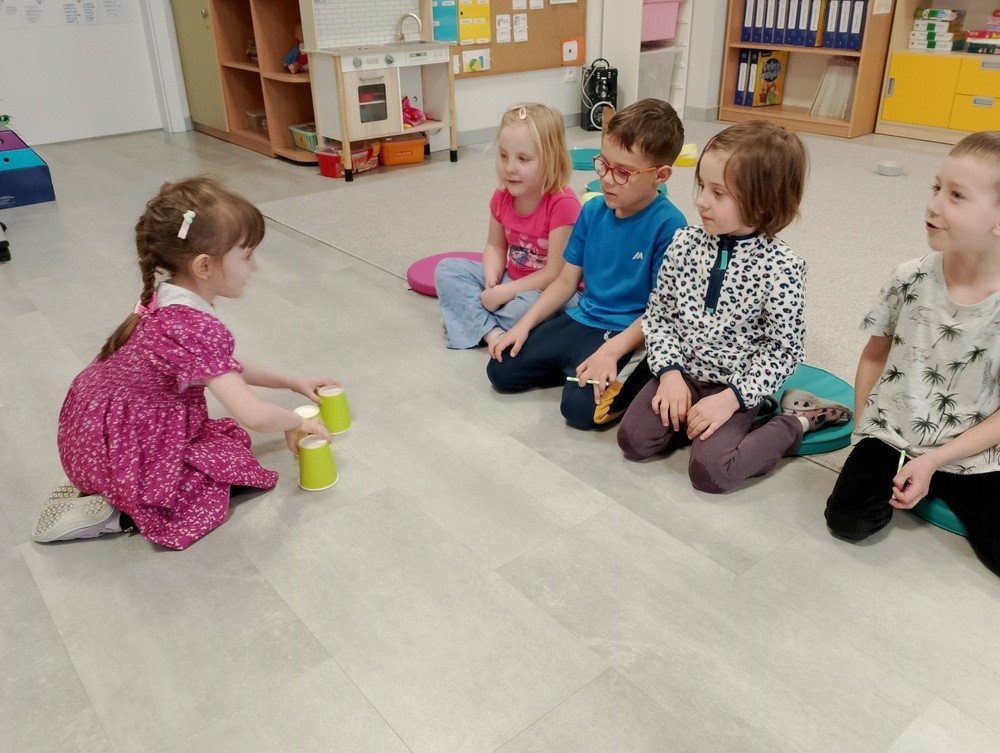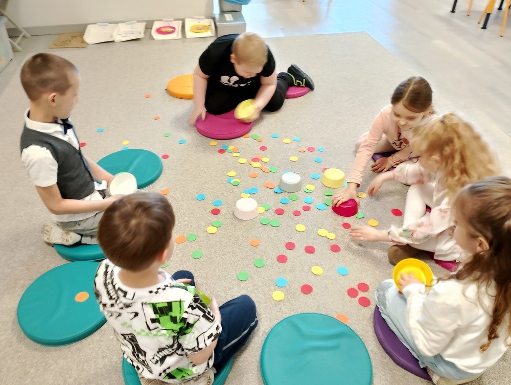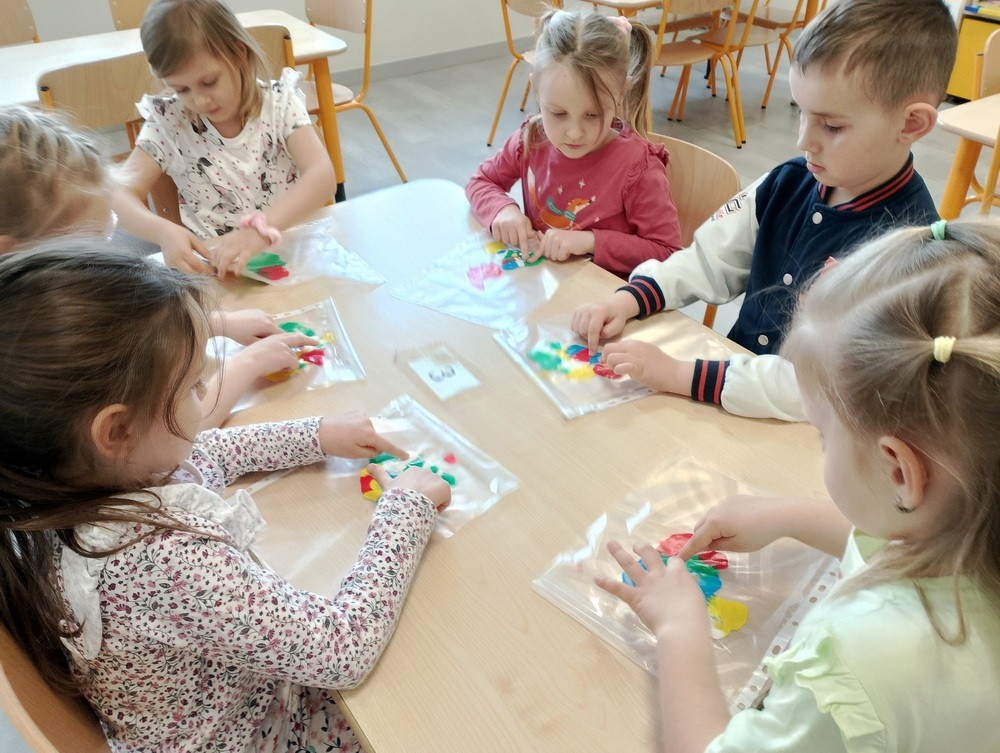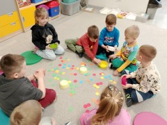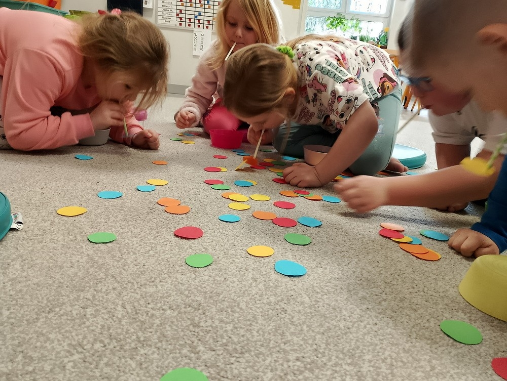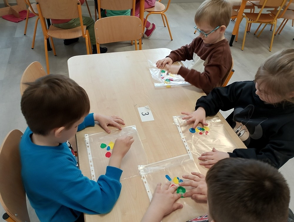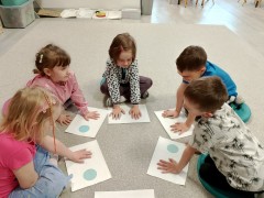 "Kropki i kropeczki"- na zajęciach terapeutycznych w pracowni małych poliglotów przedszkolaki rozwijają poczucie rytmu, umiejętności uważnego słuchania, prawidłowy tor wydechu, szybkość spostrzegania oraz usprawniają małą i dużą motorykę.