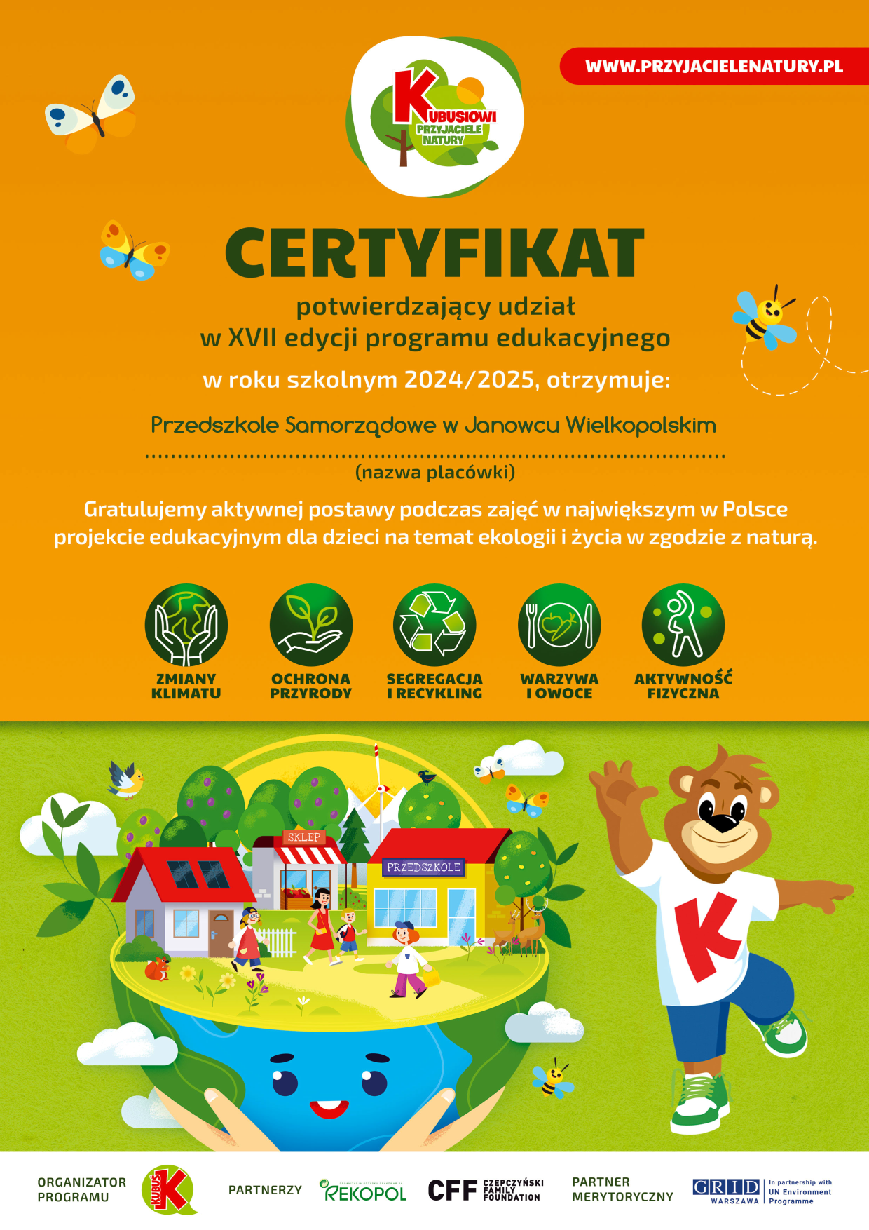 Dzieci z grupy Kotków uczestniczyły w projekcie edukacyjnym „Kubusiowi Przyjaciele Natury” w roku szkolnym 2024/2025. Odkrywały tematykę ekologiczną i życie w zgodzie z naturą.