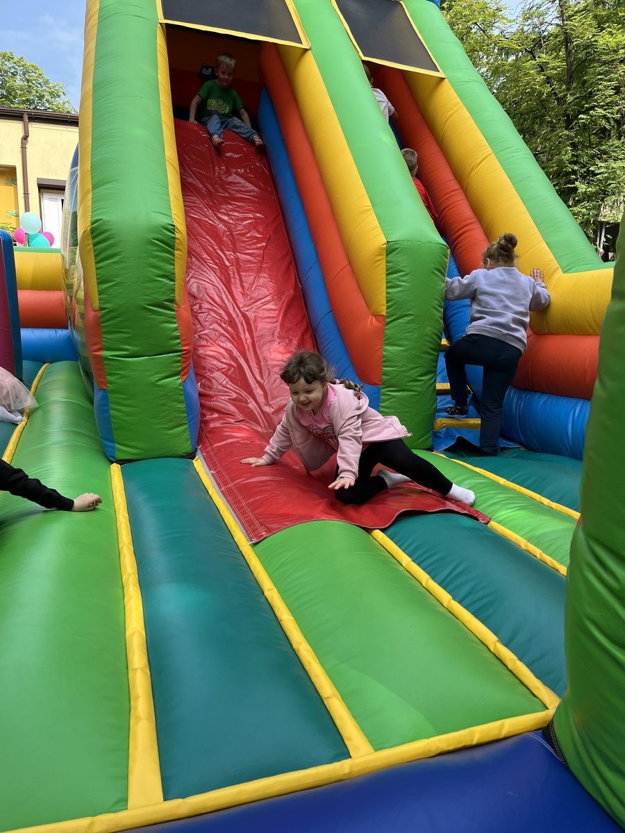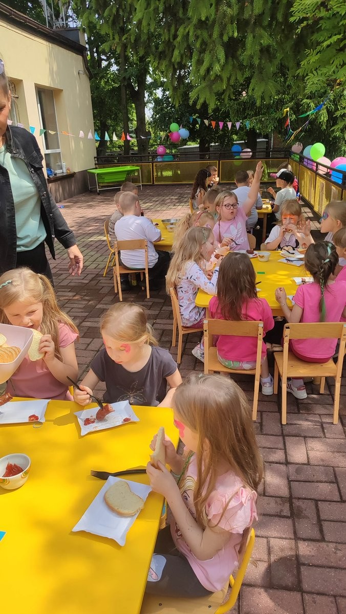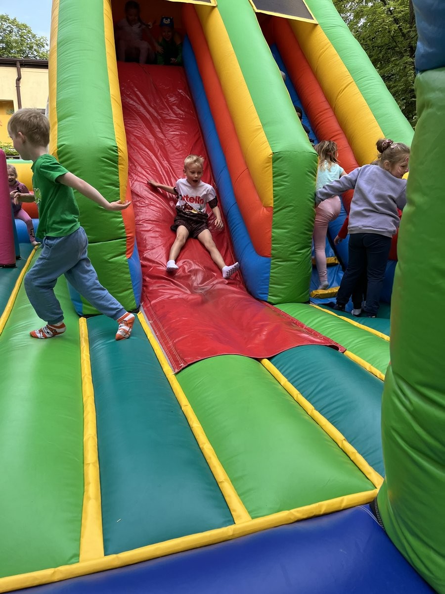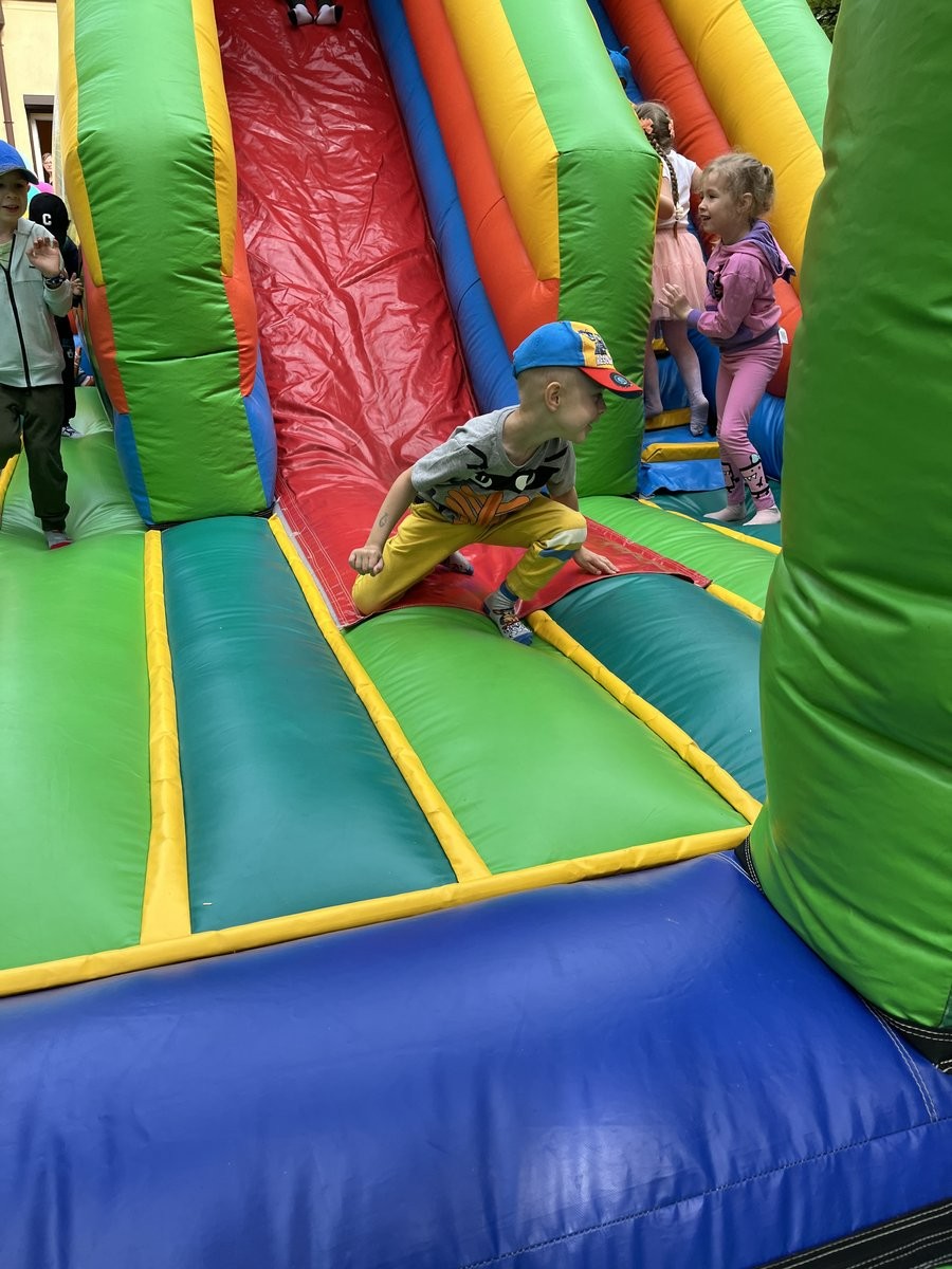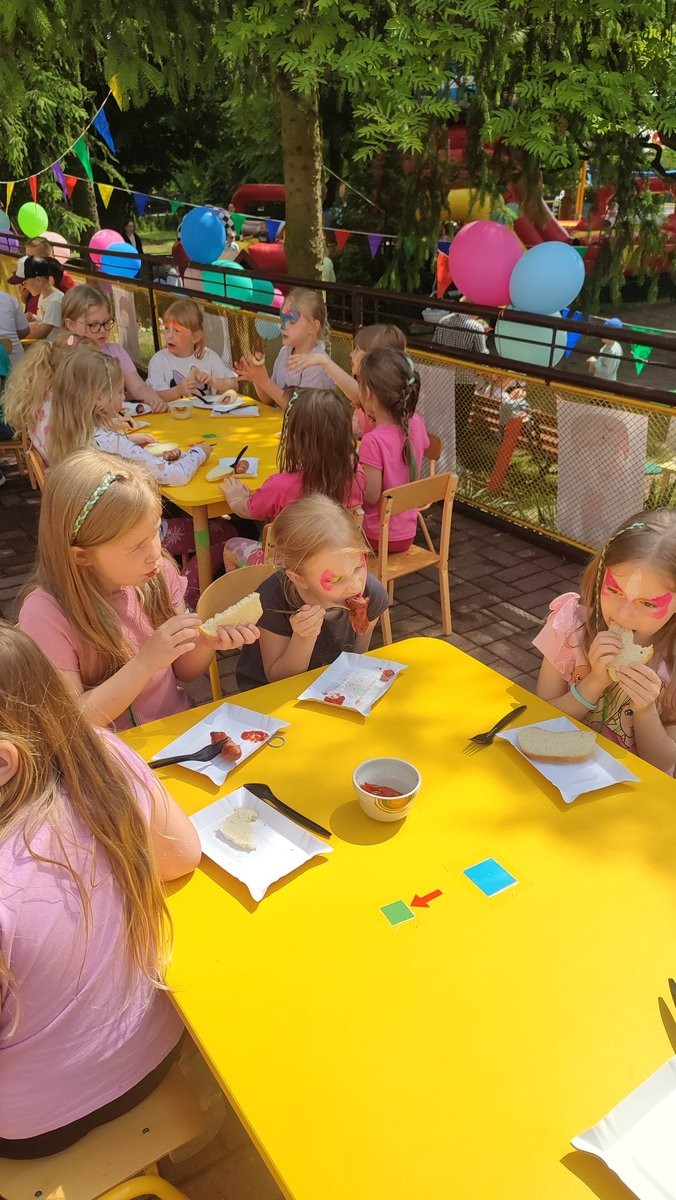 Plan dnia był bogaty w niespodzianki: po śniadaniu czekały na dzieci zabawy na dmuchańcach, puszczanie baniek mydlanych, zaplatanie warkoczyków, malowanie na folii, a także gry i zabawy ruchowe. Na koniec dzieci zjadły pieczoną kiełbaskę na obiad oraz inne smakołyki.