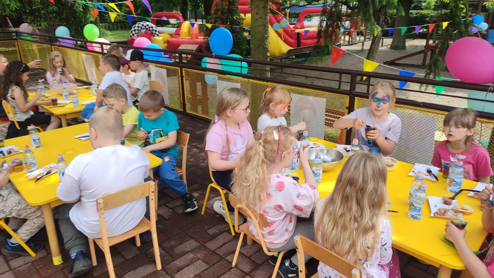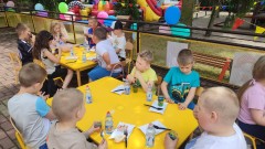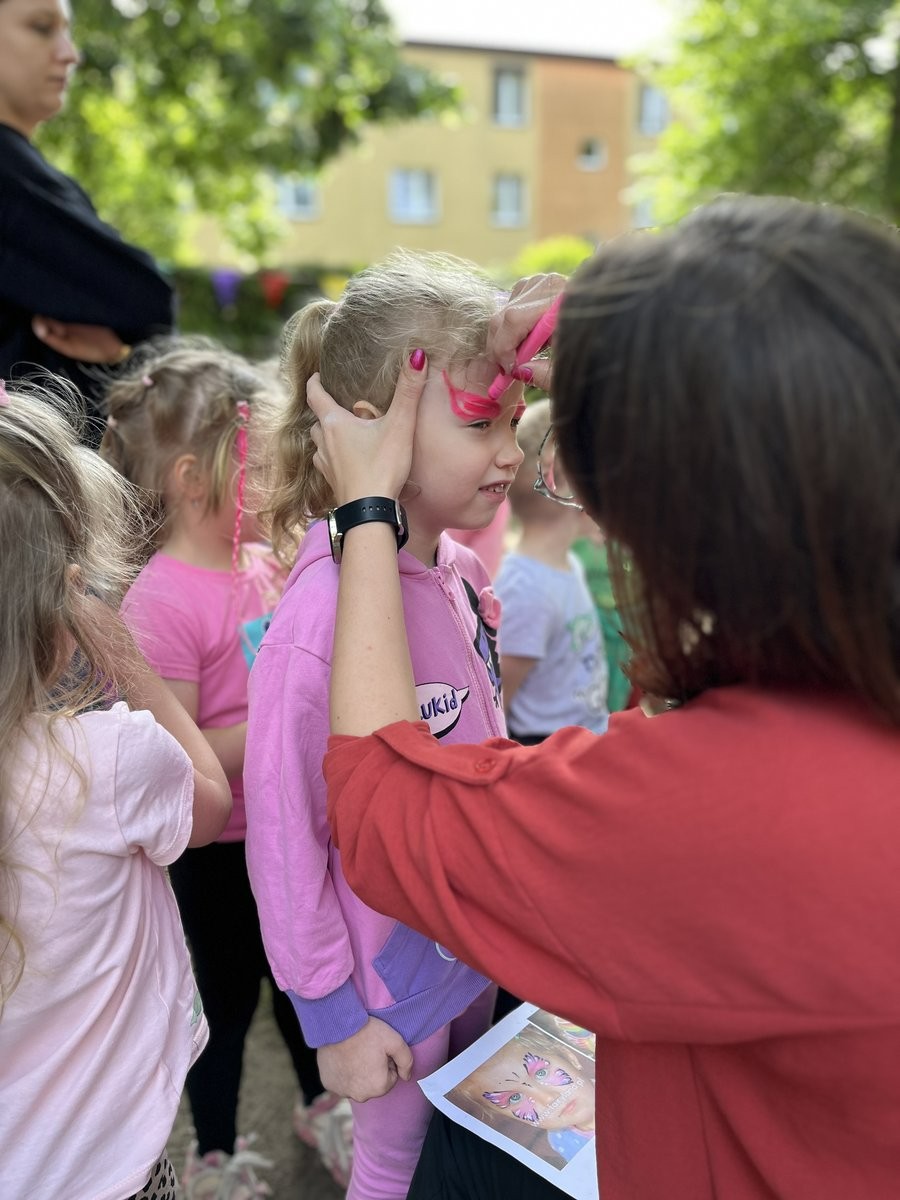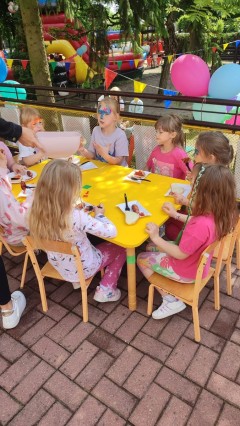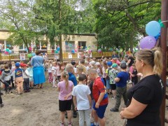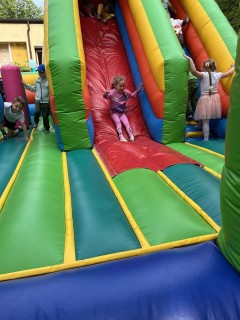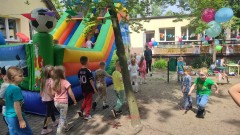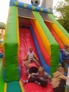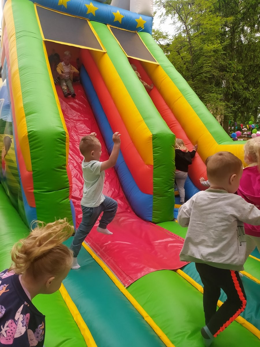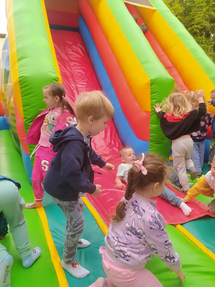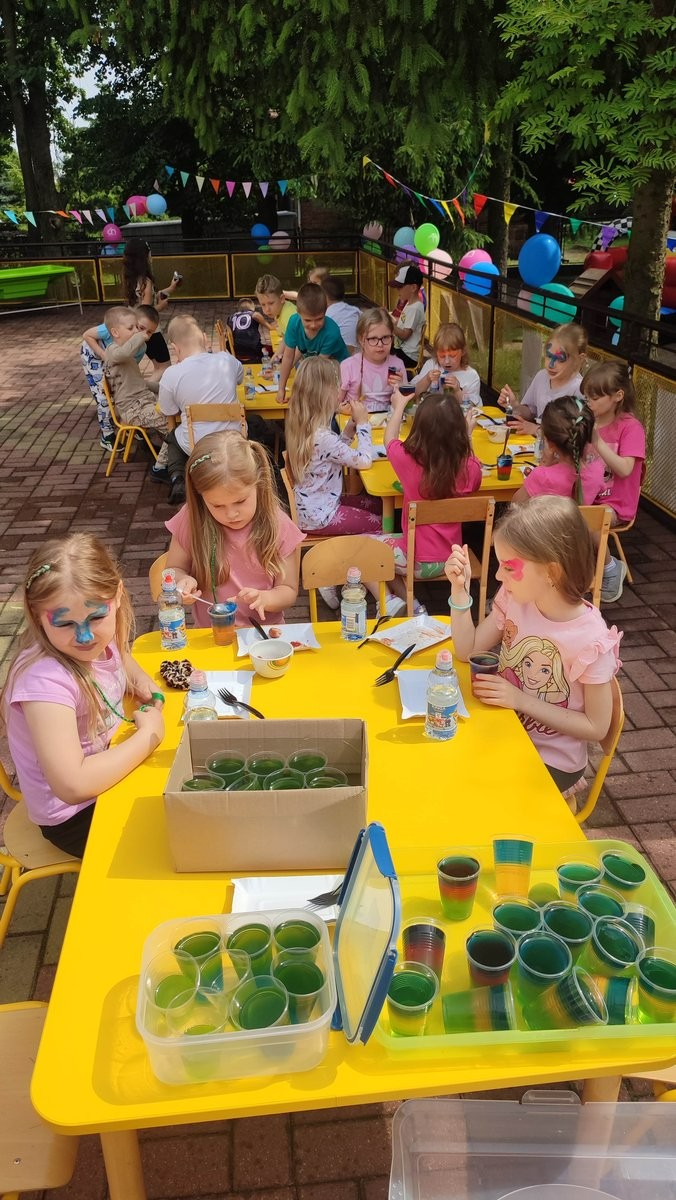Plan dnia był bogaty w niespodzianki: po śniadaniu czekały na dzieci zabawy na dmuchańcach, puszczanie baniek mydlanych, zaplatanie warkoczyków, malowanie na folii, a także gry i zabawy ruchowe. Na koniec dzieci zjadły pieczoną kiełbaskę na obiad oraz inne smakołyki.