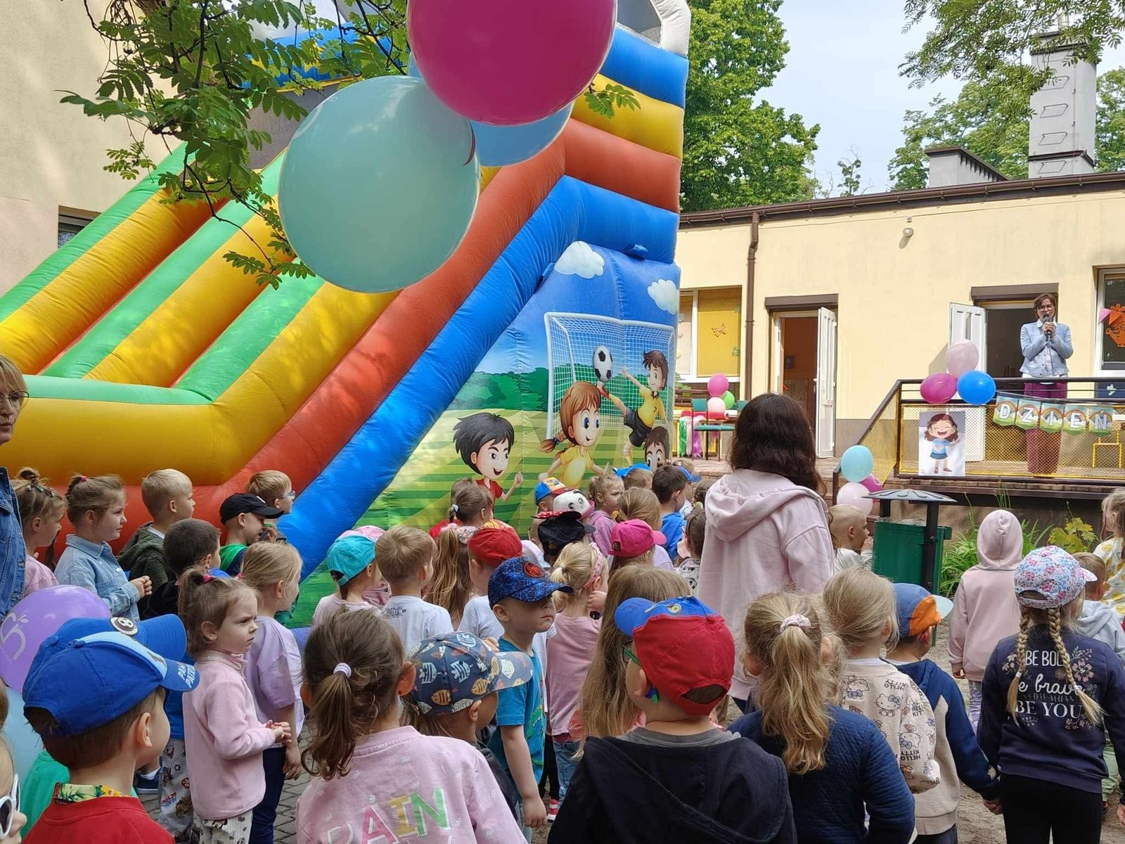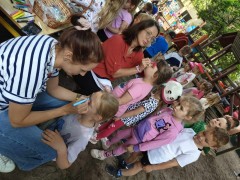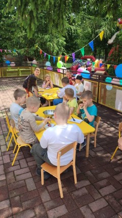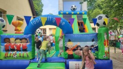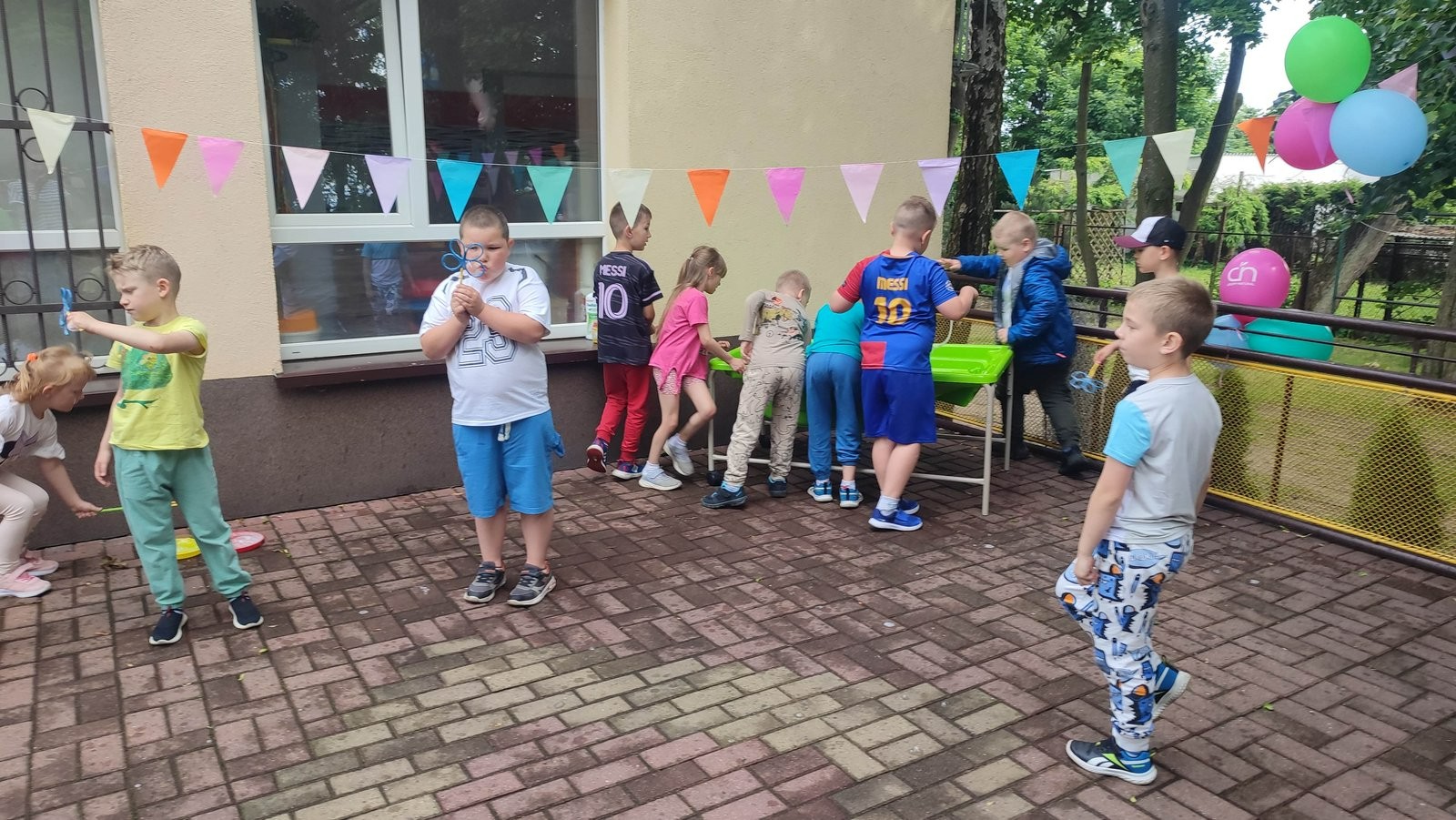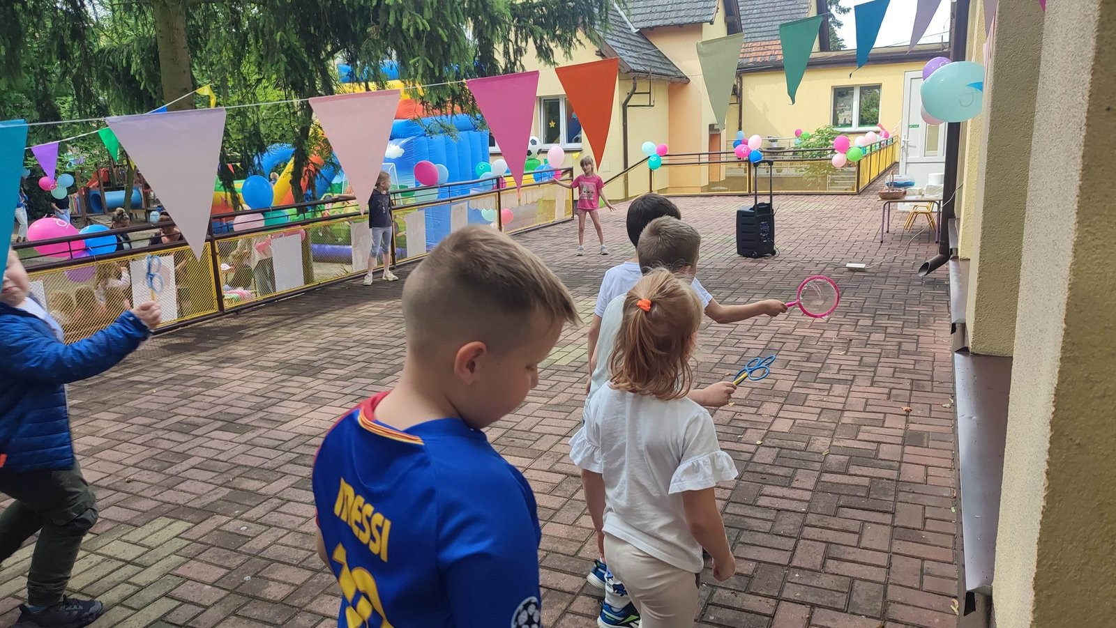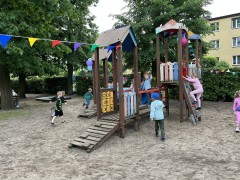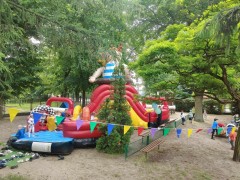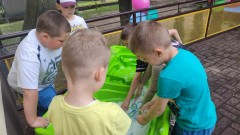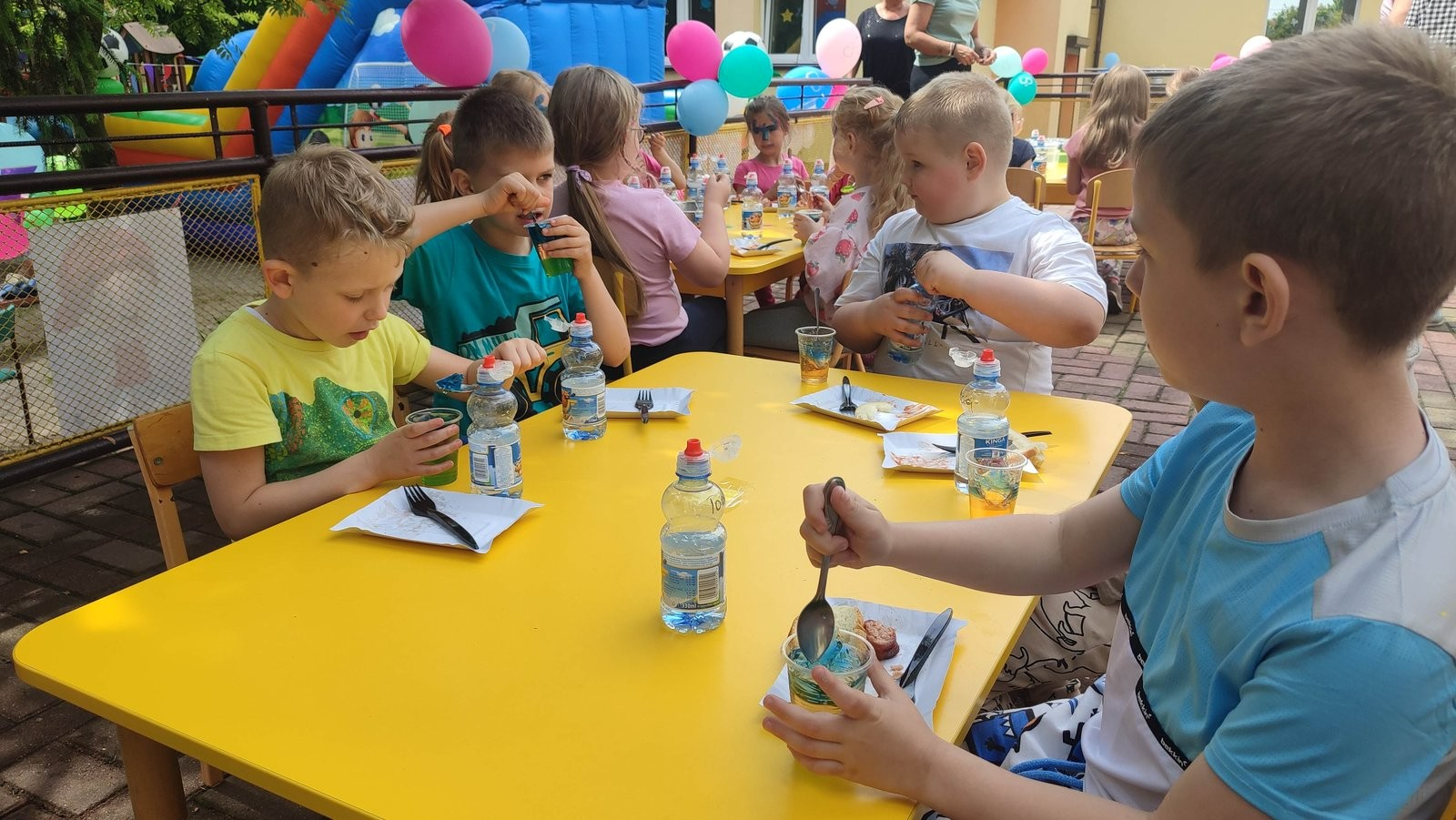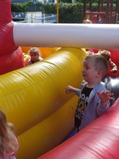 Plan dnia był bogaty w niespodzianki: po śniadaniu czekały na dzieci zabawy na dmuchańcach, puszczanie baniek mydlanych, zaplatanie warkoczyków, malowanie na folii, a także gry i zabawy ruchowe. Na koniec dzieci zjadły pieczoną kiełbaskę na obiad oraz inne smakołyki.