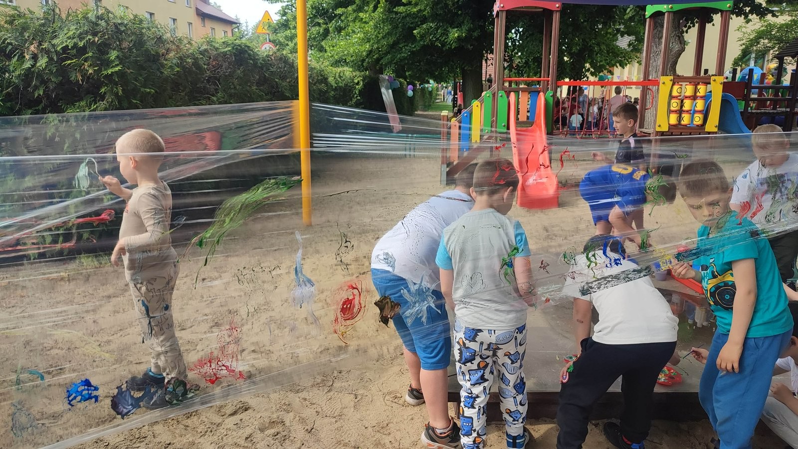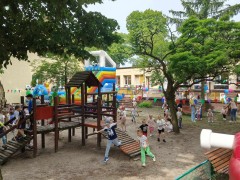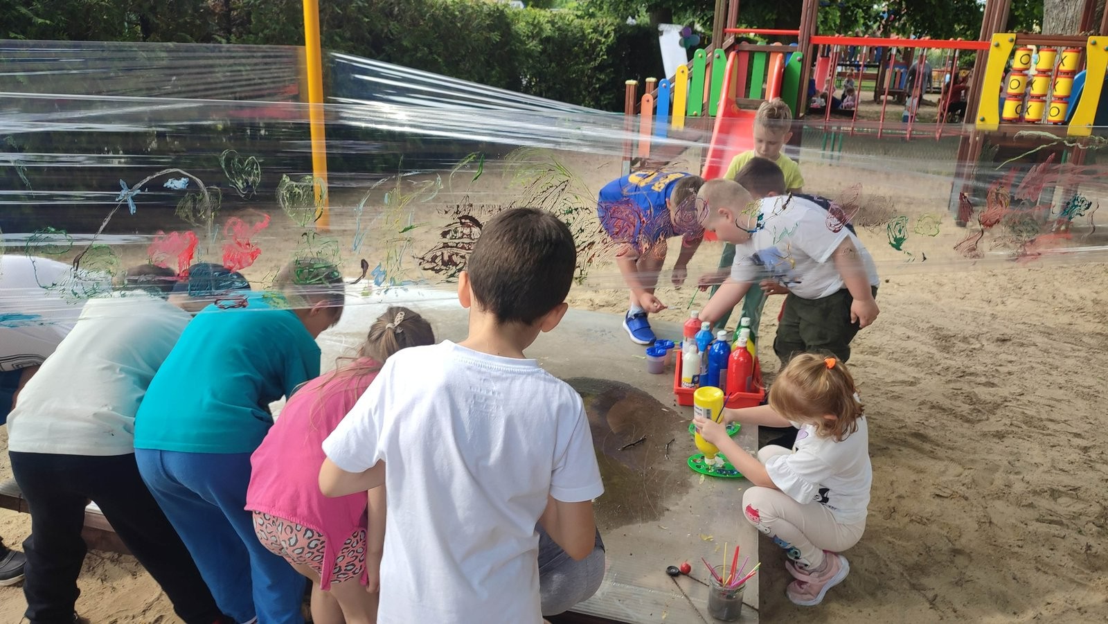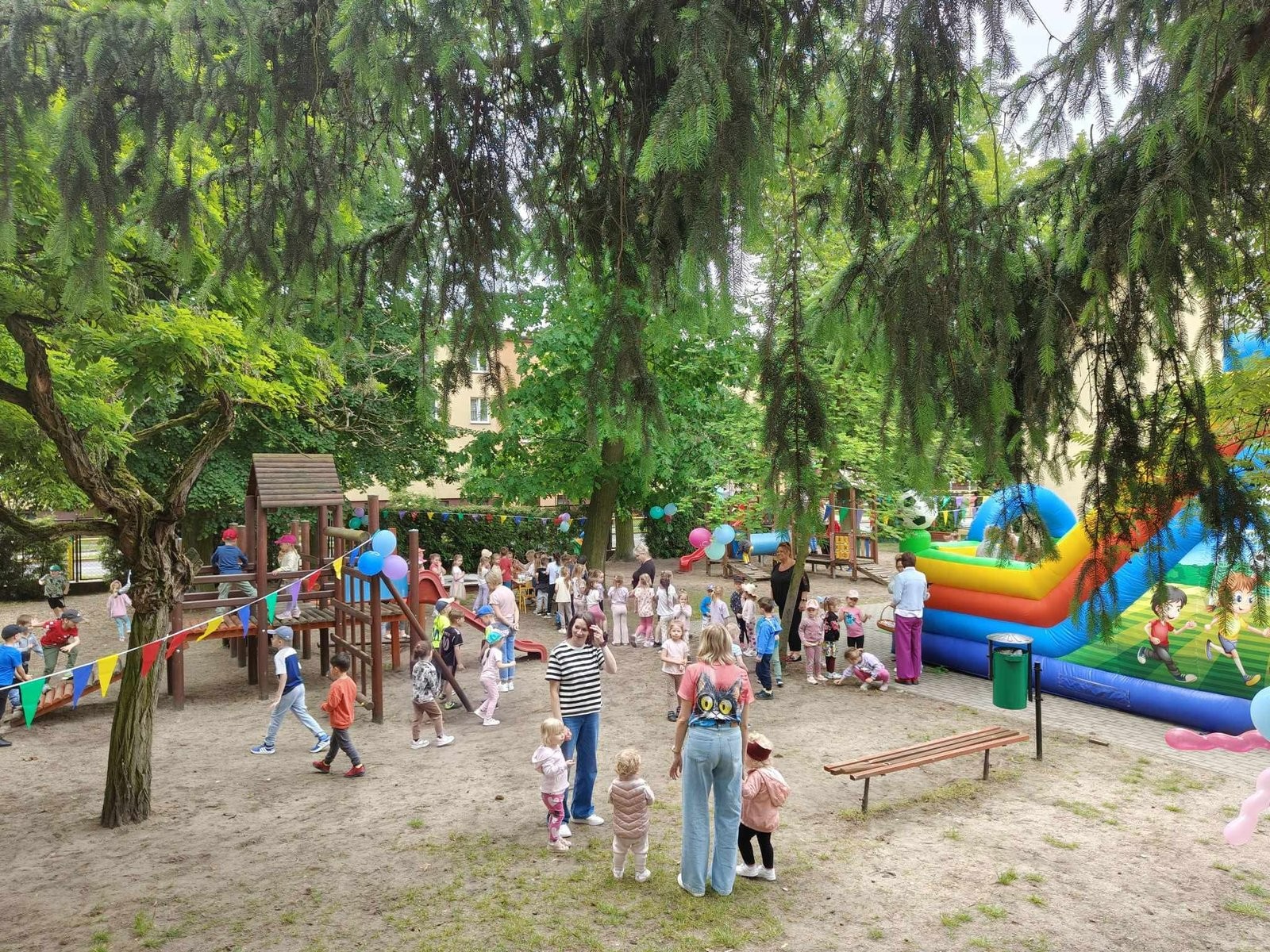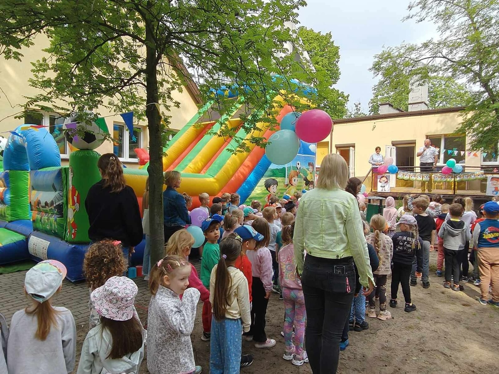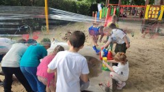 Plan dnia był bogaty w niespodzianki: po śniadaniu czekały na dzieci zabawy na dmuchańcach, puszczanie baniek mydlanych, zaplatanie warkoczyków, malowanie na folii, a także gry i zabawy ruchowe. Na koniec dzieci zjadły pieczoną kiełbaskę na obiad oraz inne smakołyki.