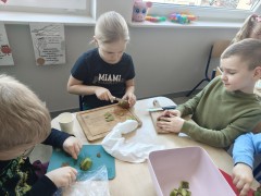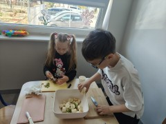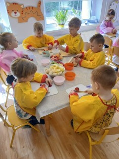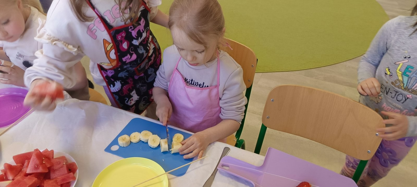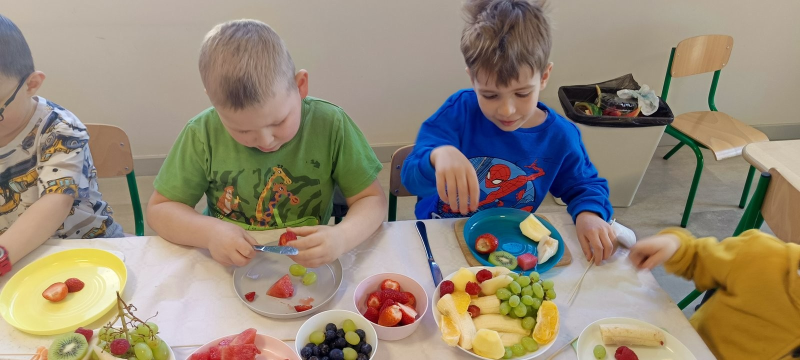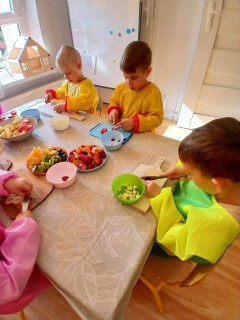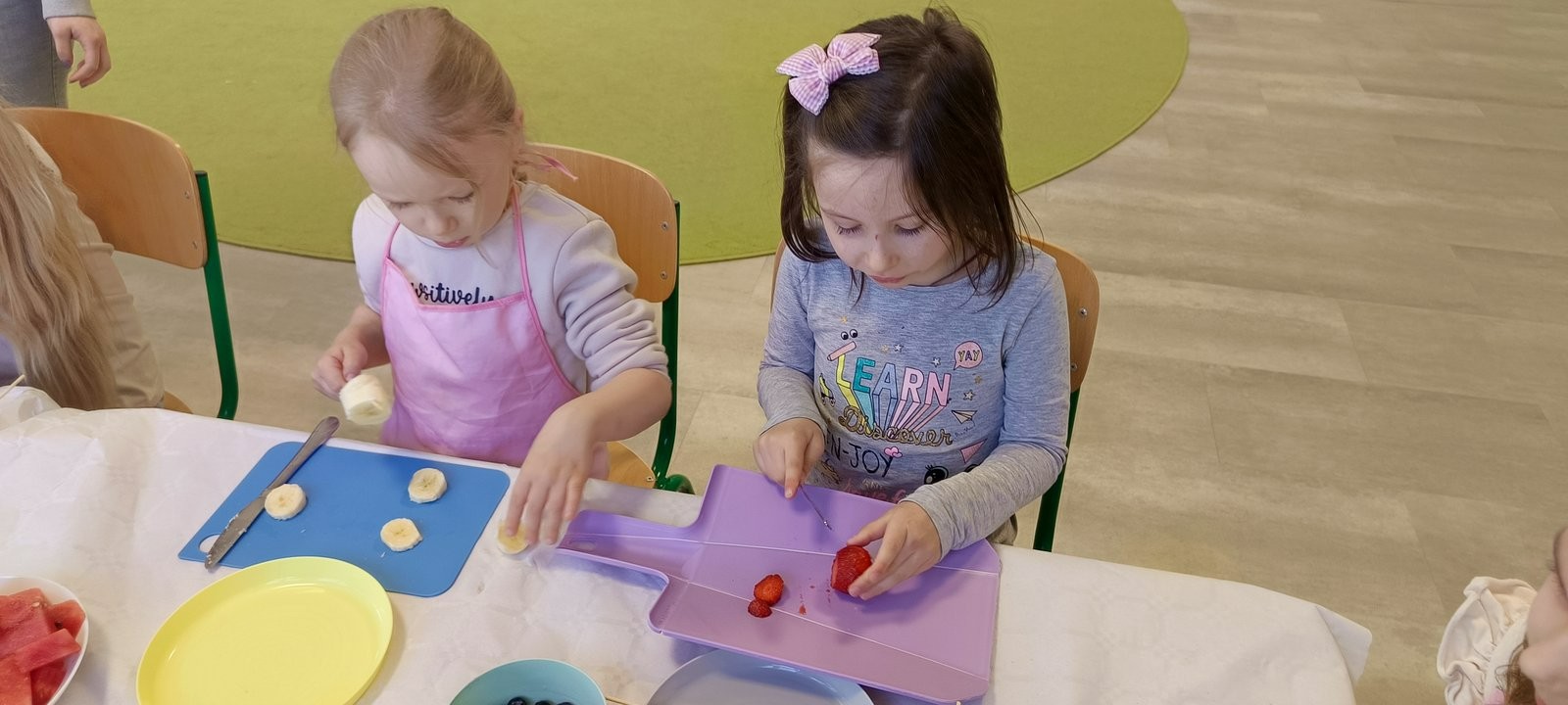 1. wykonanie sałatki owocowej przez grupę Biedronek, która nauczyła się, jak dobierać świeże owoce i ich wartości odżywcze;