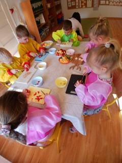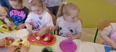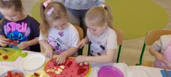 2. tworzenie kolorowych szaszłyków przez grupę Motylków i Kotków co pozwoliło dzieciom na twórczą zabawę oraz poznanie różnych smaków i tekstur;