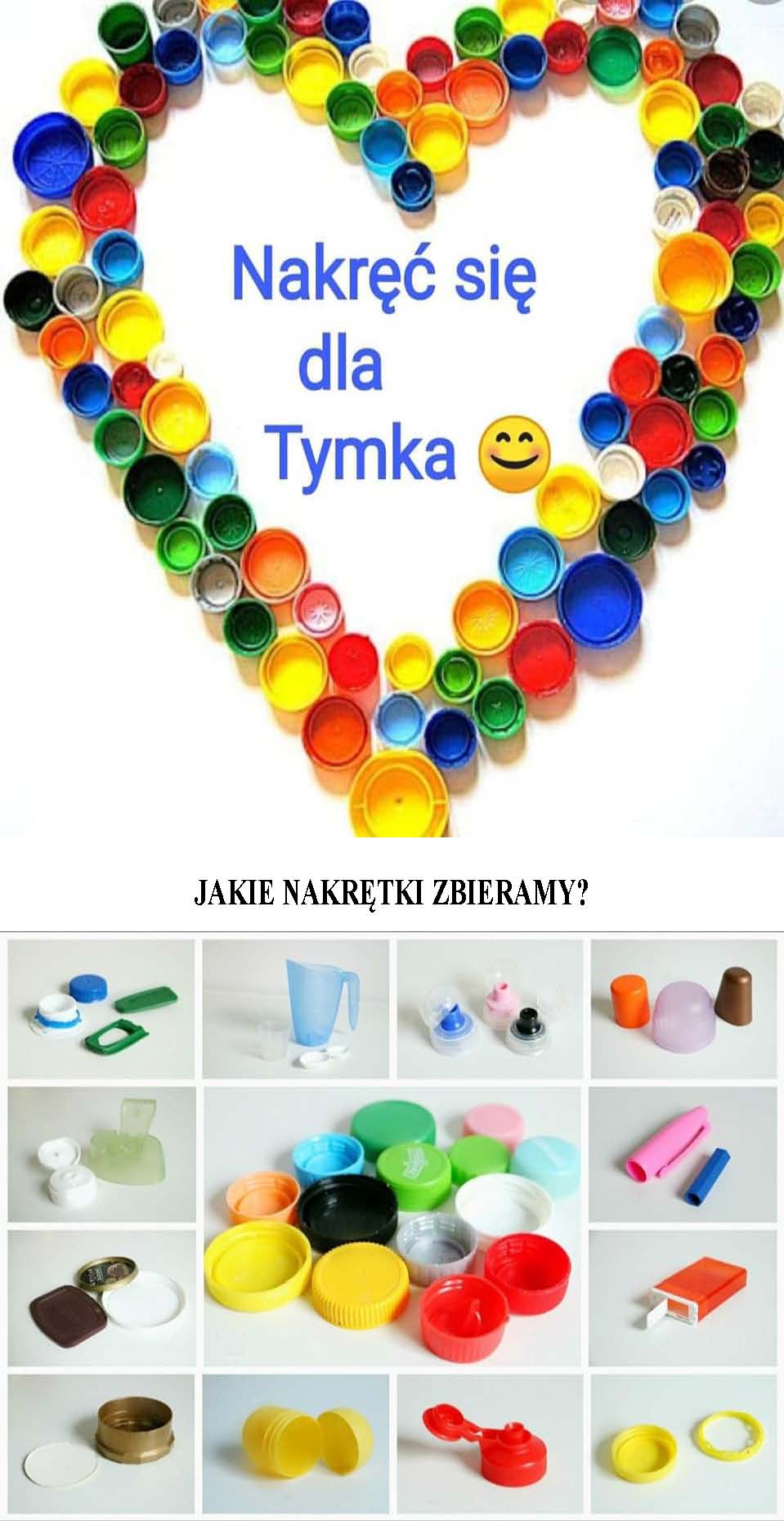 Akcja charytatywna "Zbiórka nakrętek dla Tymka" ma na celu zebranie nakrętek i przekazanie ich rodzicom chłopca. A środki pieniężne z ich sprzedaży przeznaczone będą na leczenie i rehabilitację chłopca.