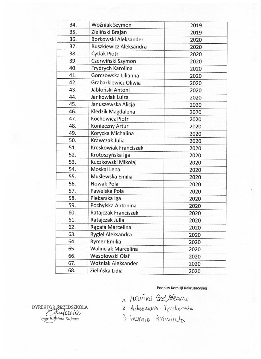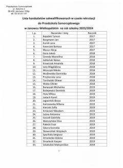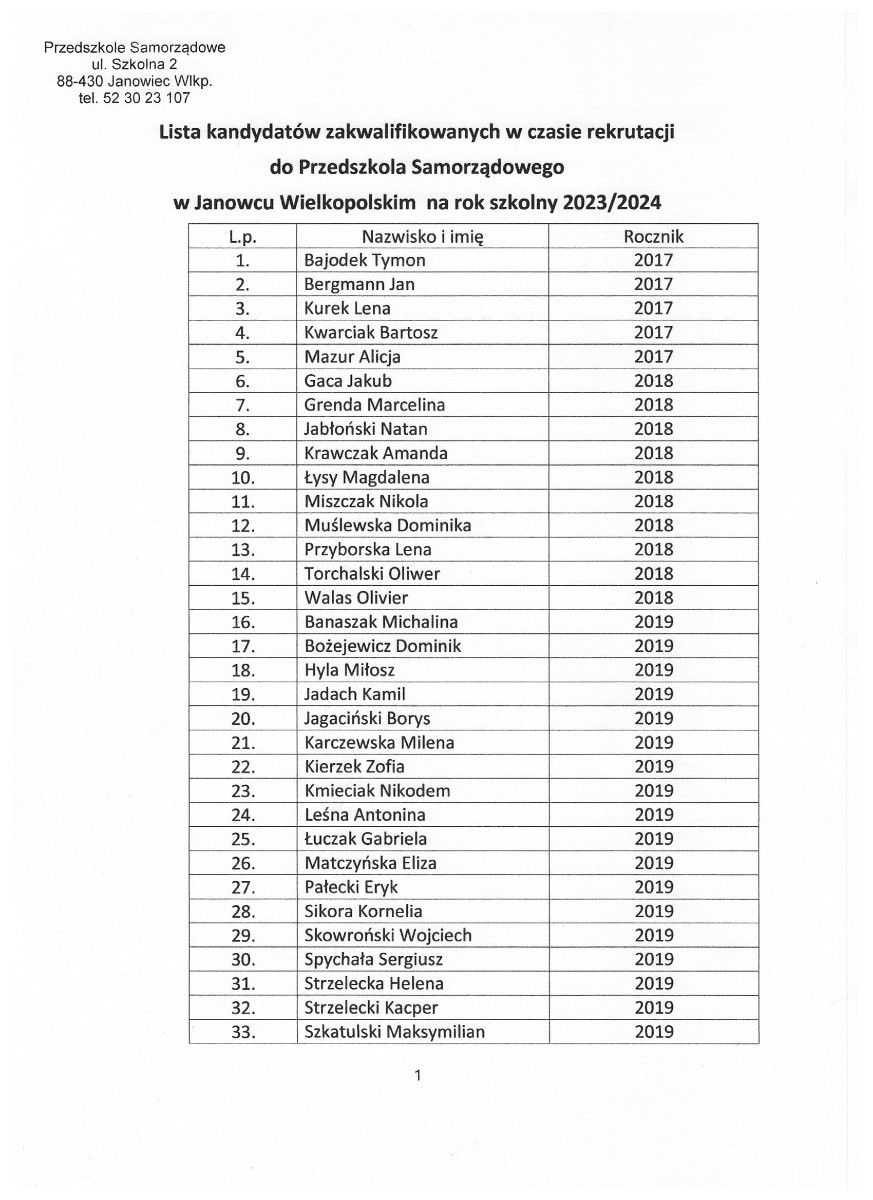 LISTA KANDYDATÓW ZAKWALIFIKOWANYCH DO PRZEDSZKOLA SAMORZĄDOWEGO W JANOWCU WIELKOPOLSKIM NA ROK SZKOLNY 2023/2024
