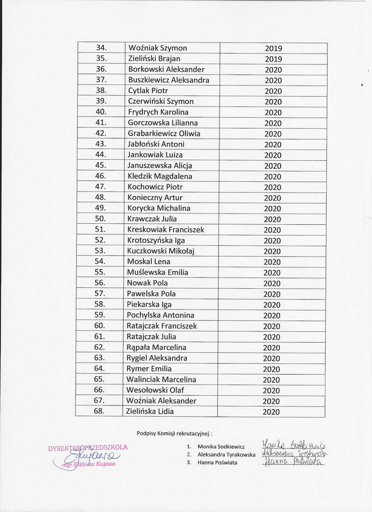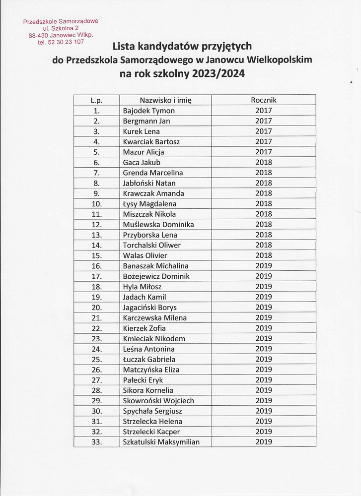 Lista kandydatów przyjętych do Przedszkola Samorządowego w Janowcu Wielkopolskim na rok szkolny 2023/24.