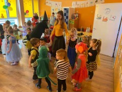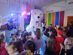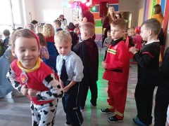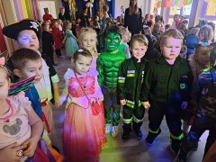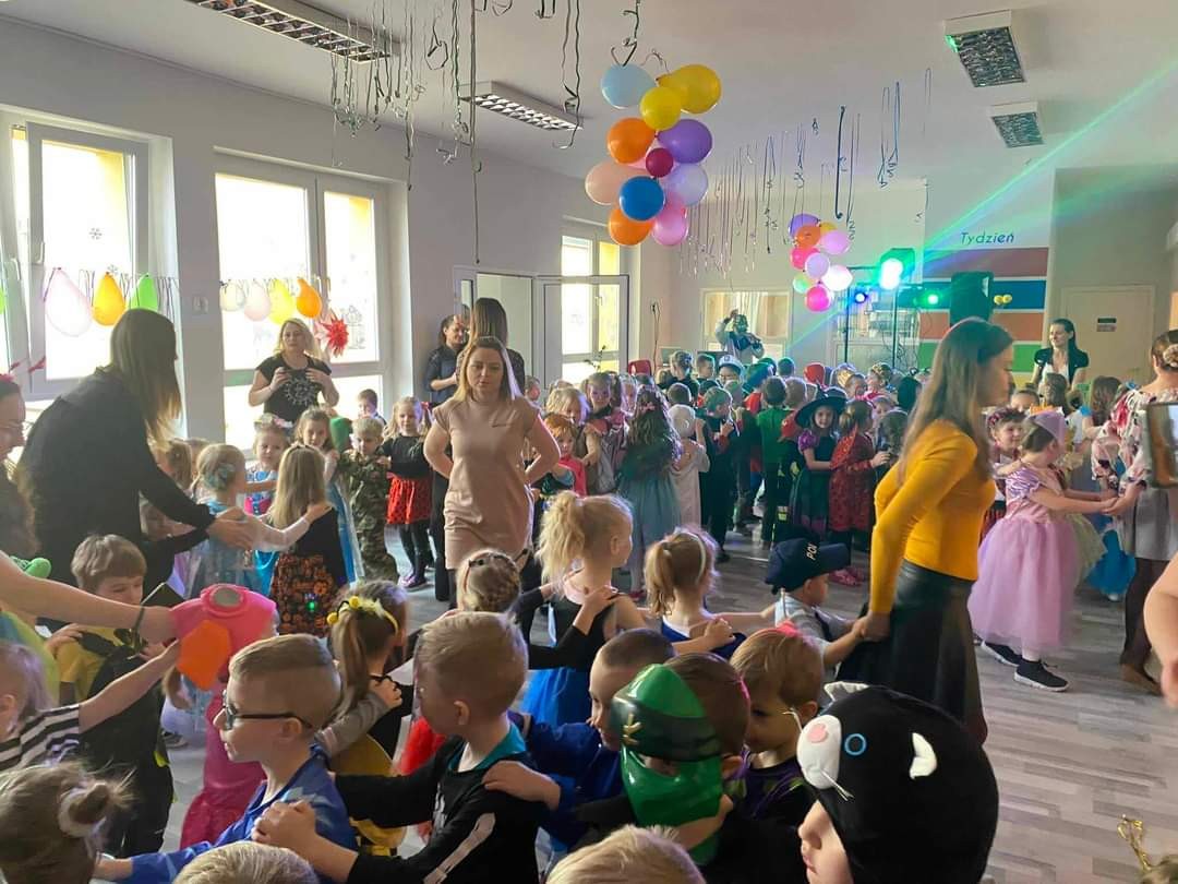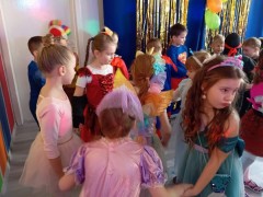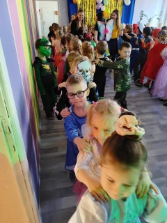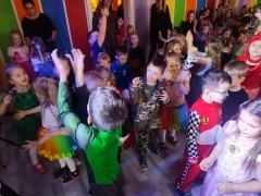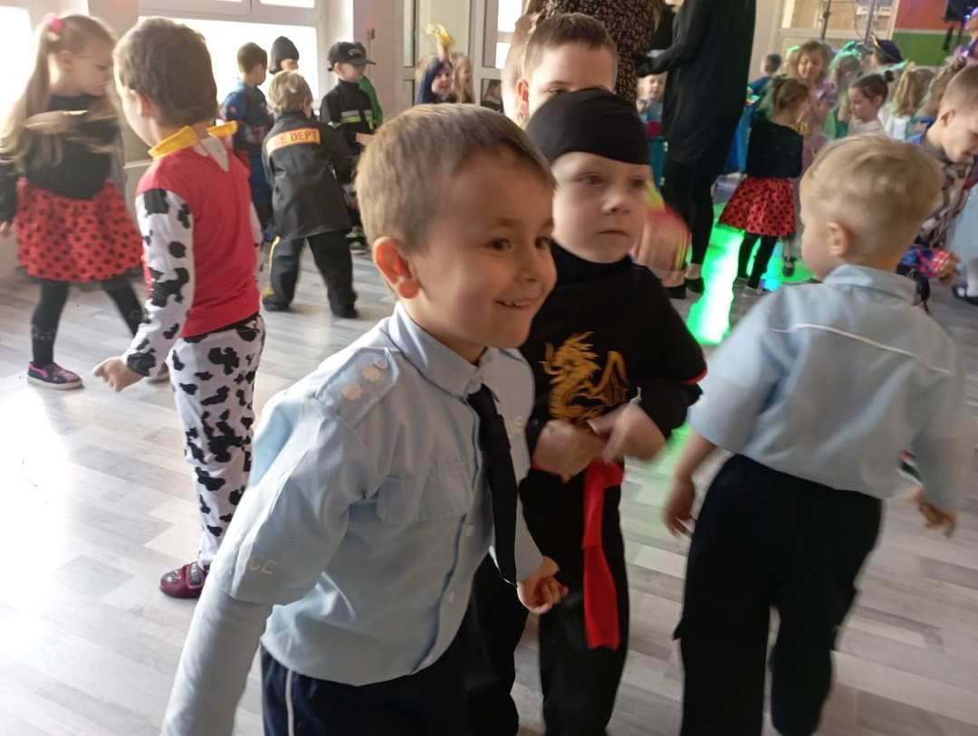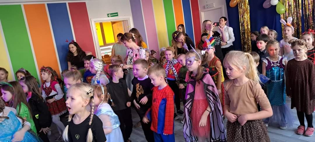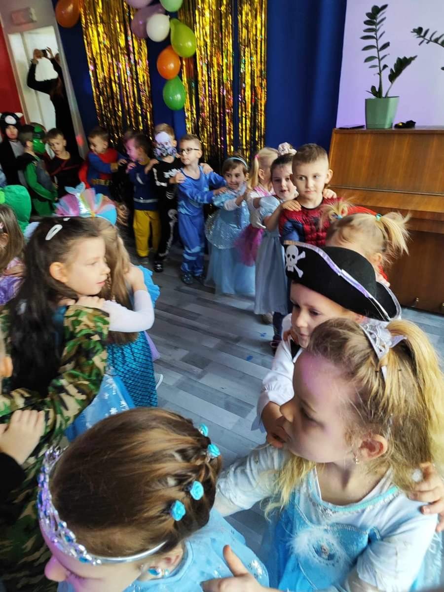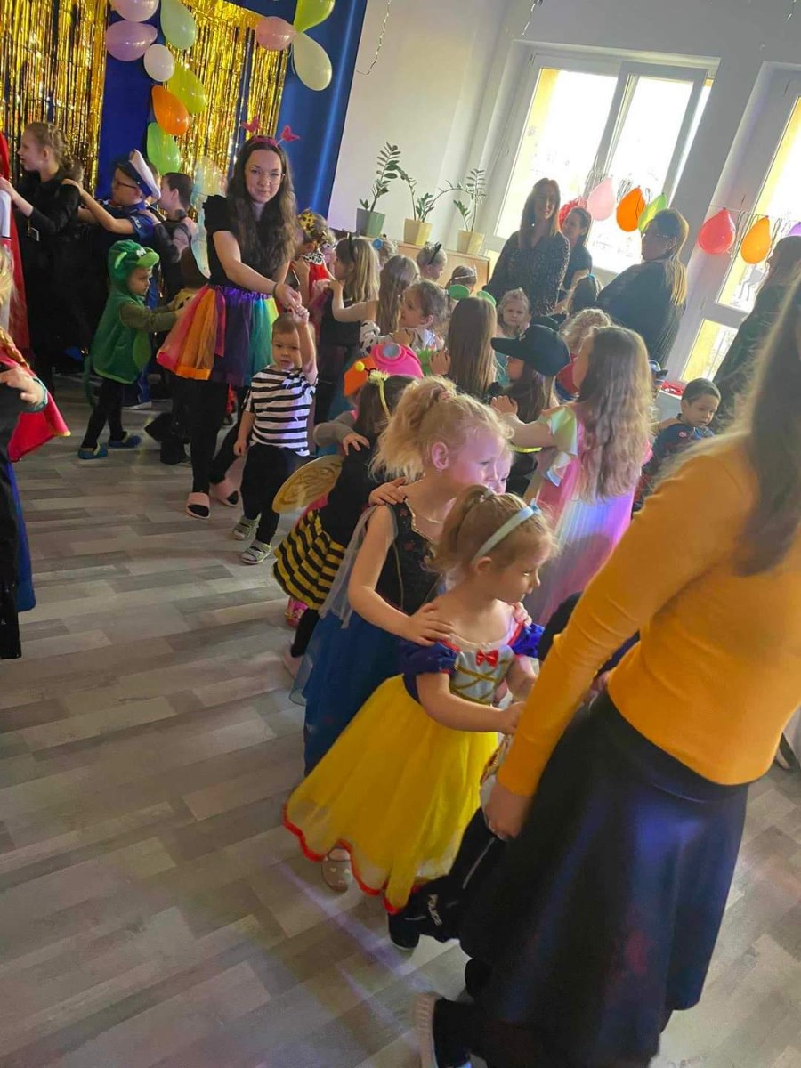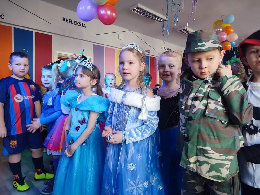 Nasze przedszkole 30.01.2024 r. zamieniło się w magiczną krainę pełną wróżek, księżniczek, rycerzy oraz innych postaci bajkowych. Dzieci z dumą prezentowały swoje wymyślne stroje czerpiąc przy tym mnóstwo radości. Wystrój sali wprowadził dzieci w radosny nastrój oraz zachęcał wszystkich do wesołej zabawy. Kiedy pojawiły się pierwsze rytmy wesołej muzyki, to wszystkie przedszkolaki z wielką ochotą rozpoczęły pląsy i tańce. Wszyscy bawili się znakomicie!