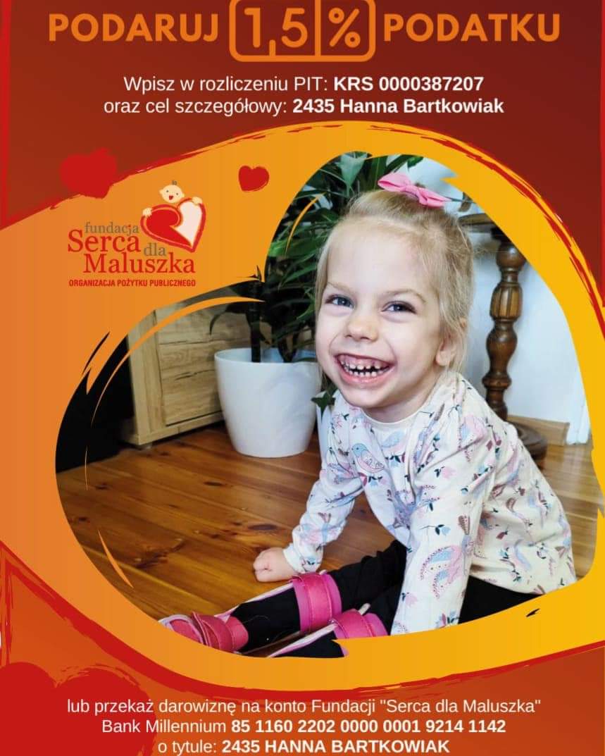 Zachęcamy do przekazania 1,5% podatku dla Hani lub Tymka. Przypominamy, że przez cały rok można wspierać ich leczenie również poprzez włączanie się w akcję zbierania nakrętek.