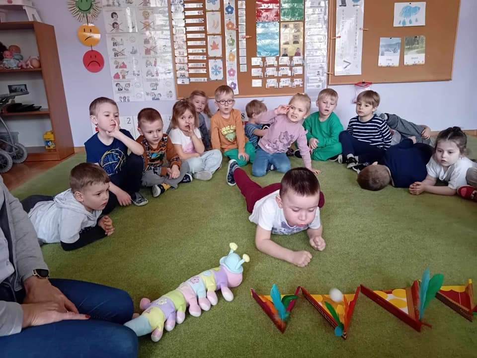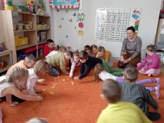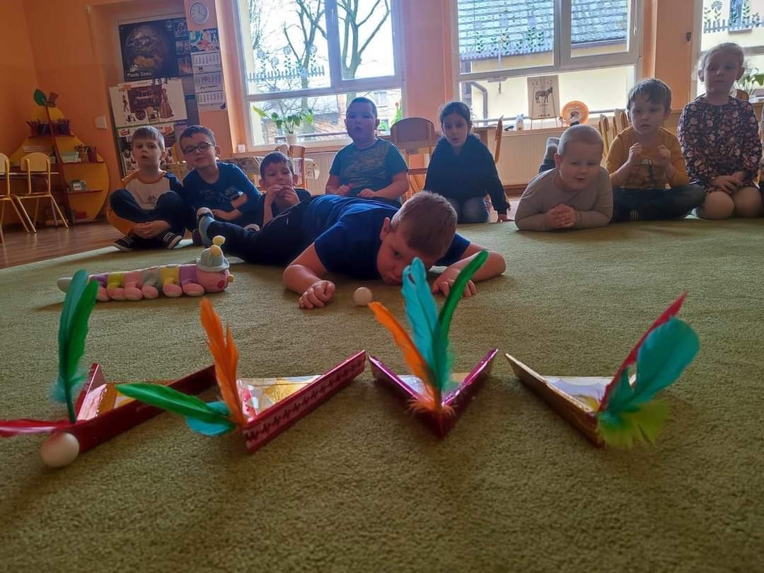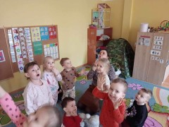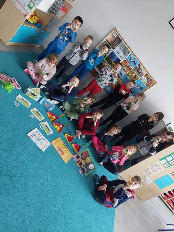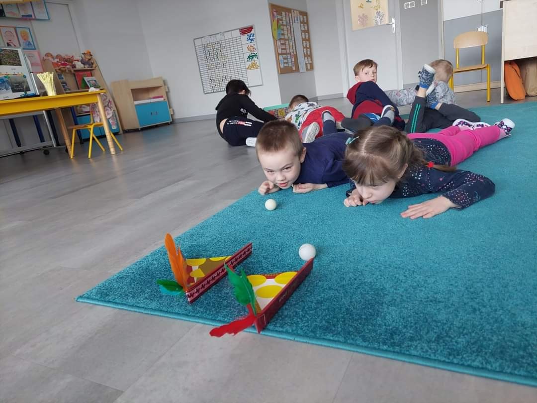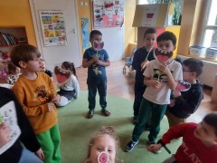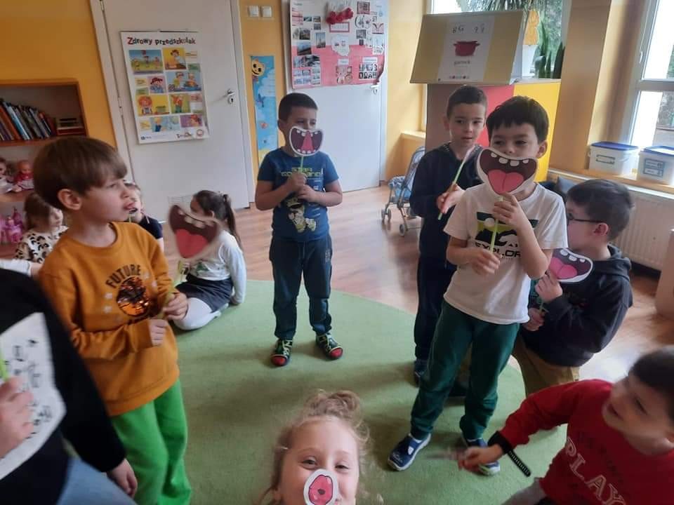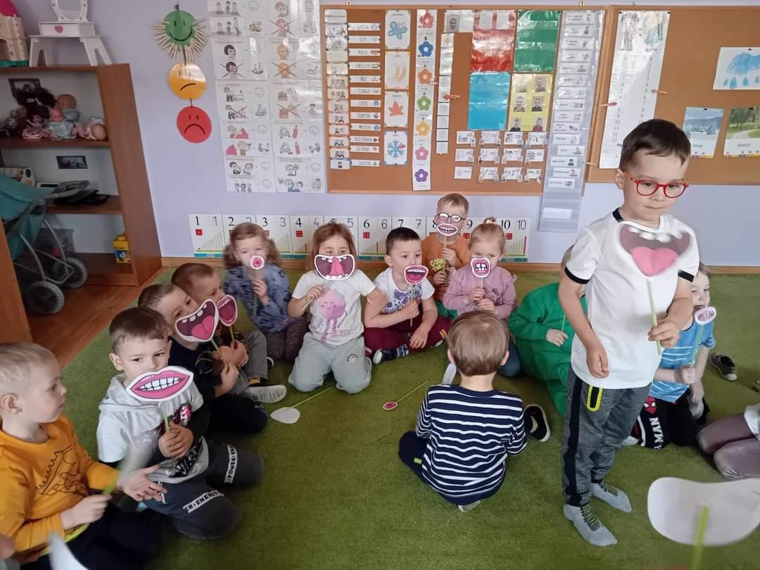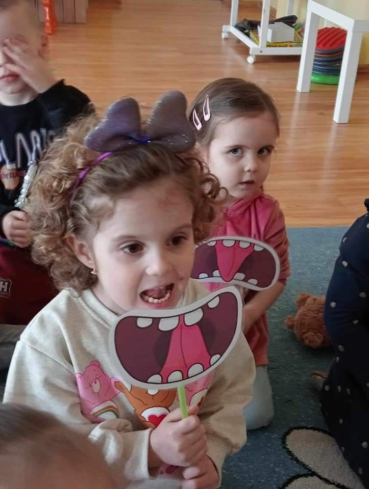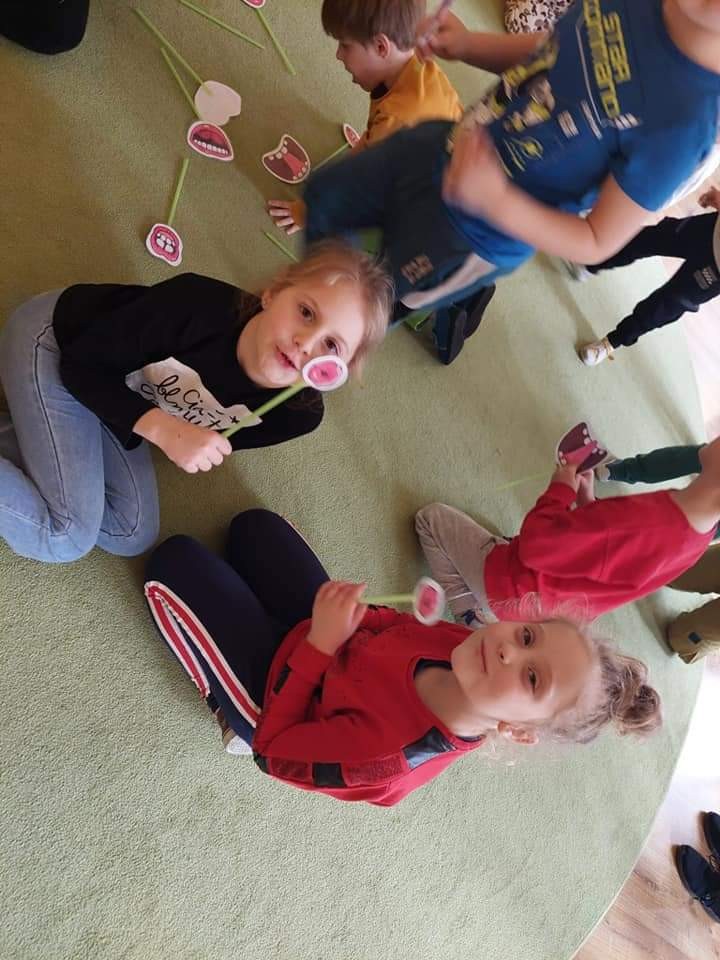 Najwięcej radości sprawiły dzieciom zabawy oddechowe, artykulacyjne i logorytmiczne przygotowane przez panią Sylwię, naszą przedszkolną logopedę.